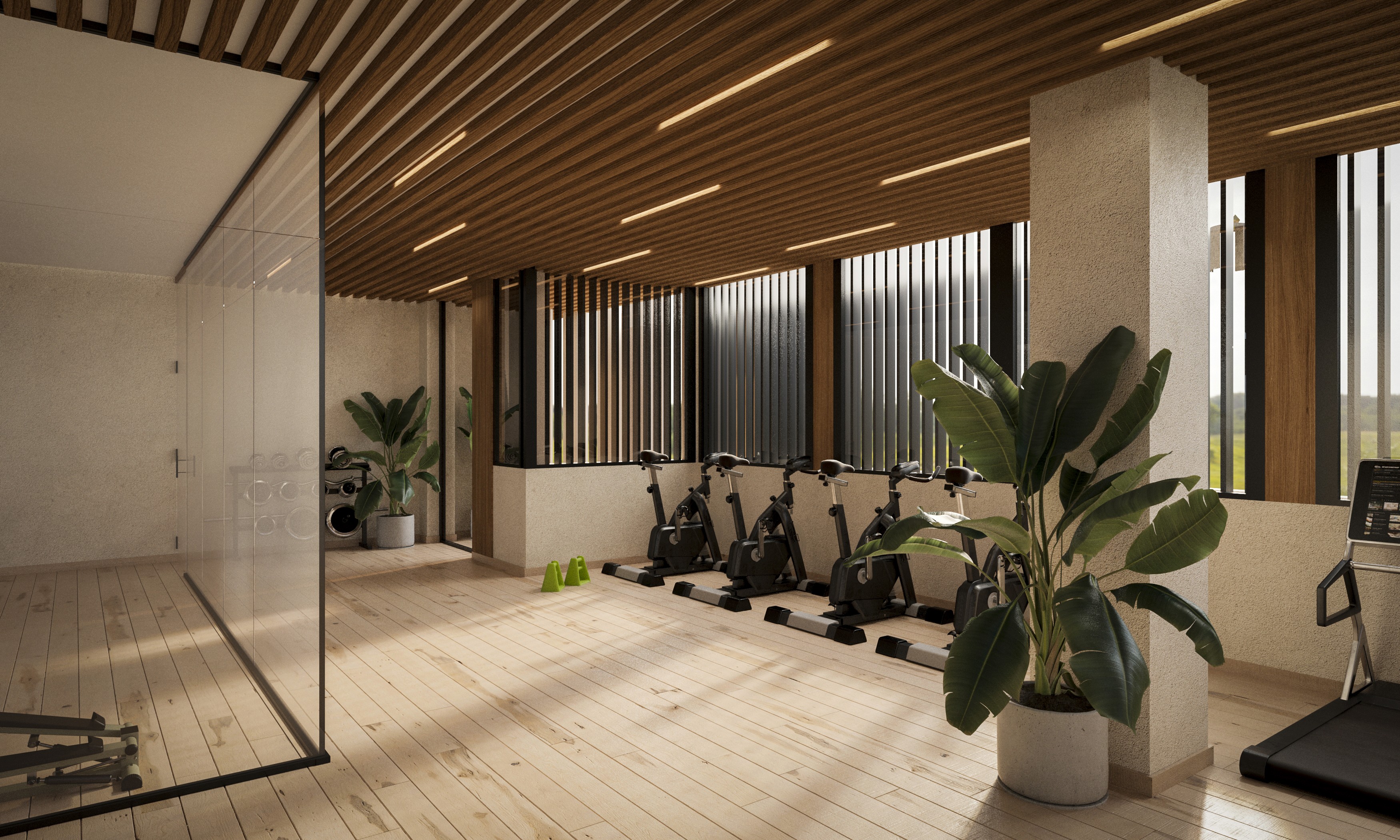 El gimnasio de Savie Tulum está equipado para satisfacer las necesidades de quienes buscan mantenerse activos. Con un diseño moderno y vistas que inspiran, este espacio permite a los residentes ejercitarse mientras se conectan con el entorno natural. Es un lugar donde el bienestar físico y mental se fusionan en armonía.