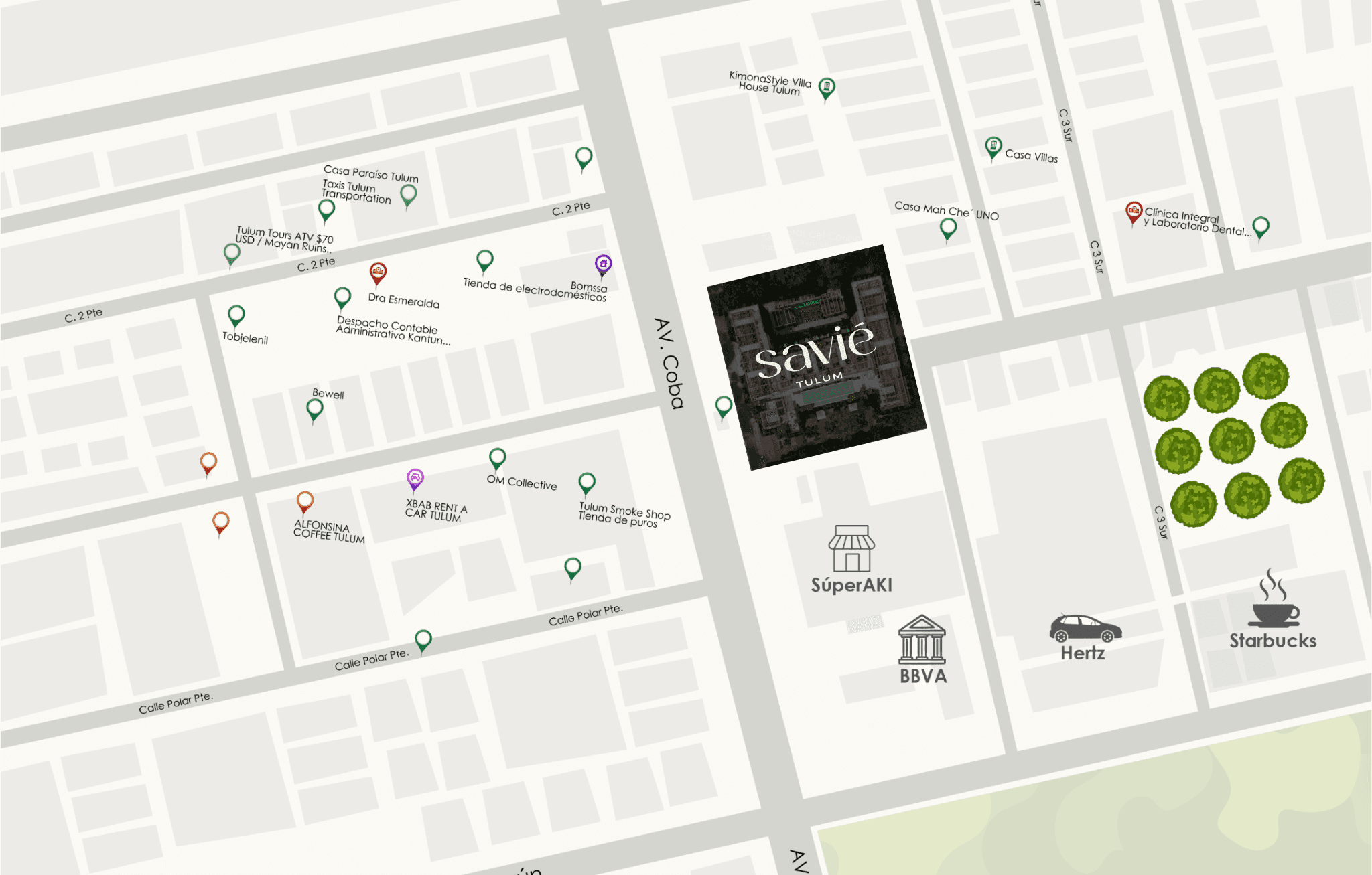 Savié Tulum está convenientemente situado cerca del centro de Tulum, un lugar donde la cultura local y la modernidad se fusionan. A pocos pasos del desarrollo, los residentes encontrarán puntos clave como la estación de ADO, ideal para viajes a Cancún o Playa del Carmen, y el supermercado Chedraui Selecto, perfecto para las necesidades diarias. Además, la presencia de servicios como Starbucks, Súper AKI, BBVA y el hospital Costamed garantiza que todas las comodidades modernas estén a solo unos minutos, sin sacrificar la tranquilidad de la zona.